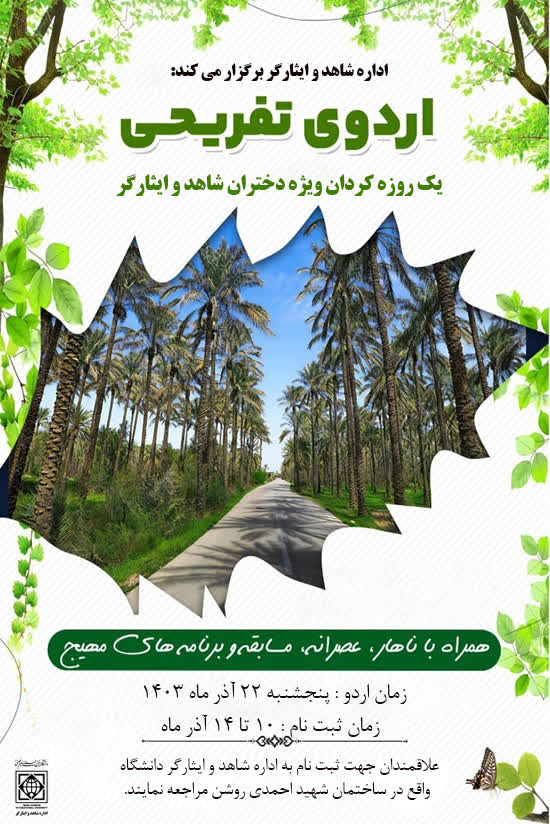 اداره شاهدوایثارگر اردوی تفریحی یکروزه ویژه دختران شاهد و ایثارگر برگزار می کند.