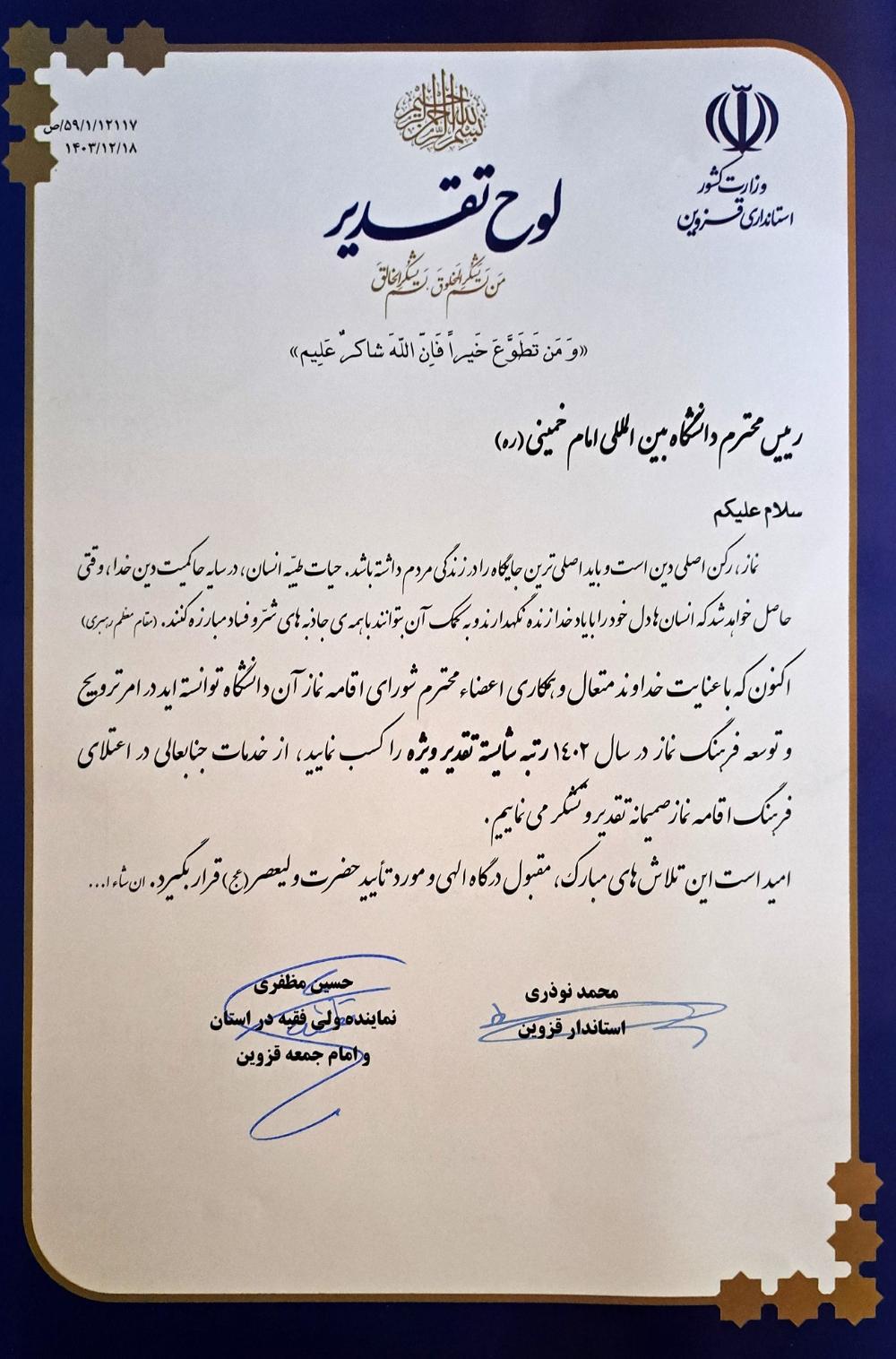 قدردانی ستاد اقامه نماز استان از دانشگاه بین‌المللی امام‌خمینی(ره)
